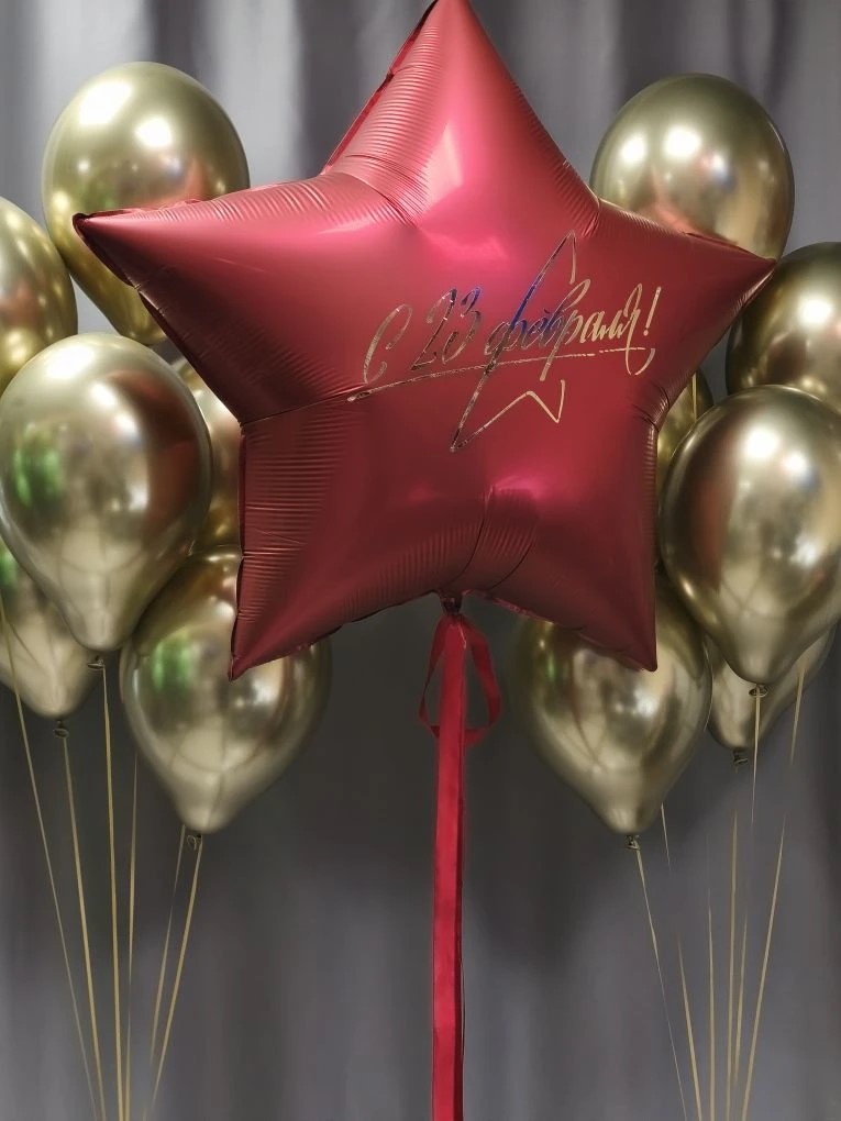 12-37. Набор шаров с красной звездой - 12500р. (цифры 23, звезда 90см, фонтан 9 золотых шаров, 13 звезд с дождиком) |